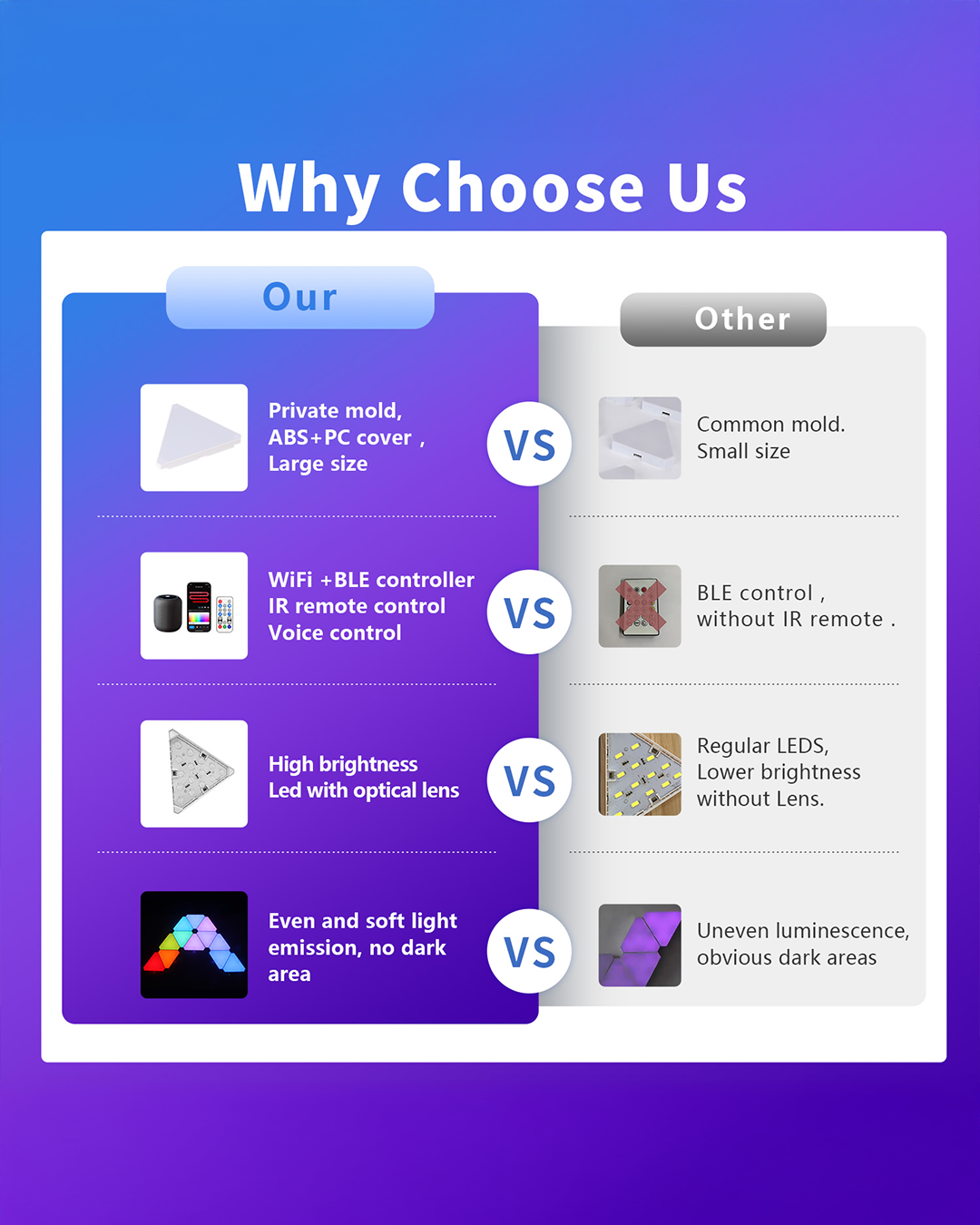 تتميز بإمكانية التحكم عبر تطبيق الموبايل أو الريموت، مع مؤثرات إضاءة متعددة وتوافق مع الموسيقى. المميزات: أكثر من 16 مليون لون قابل للتخصيص تحكم عن طريق تطبيق الهاتف + ريموت كنترول وضع التفاعل مع الموسيقى تصميم DIY لتركيب الألواح بالشكل اللي يناسبك إضاءة ناعمة وموحدة سهلة التثبيت مع لواصق 3M قوية محتويات الباكج: 9 ألواح إضاءة مثلثية (18 سم للقطعة) ريموت تحكم محول طاقة موصلات للربط بين الألواح لواصق 3M للتثبيت أدوات تثبيت إضافية